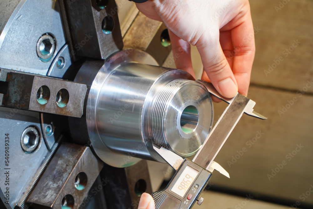 Hands of an engineer measures a metal part with a digital vernier caliper. Quality control of part machined on a lathe,Quality control concept of Qc.