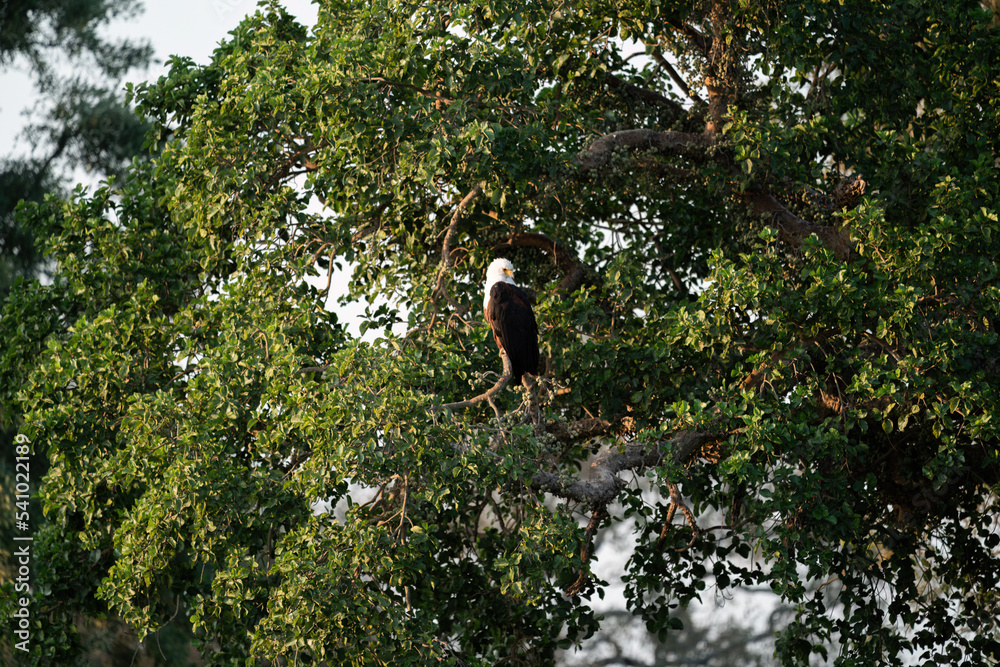A wide shot of an African fish eagle perched in a green tree in wilderness.