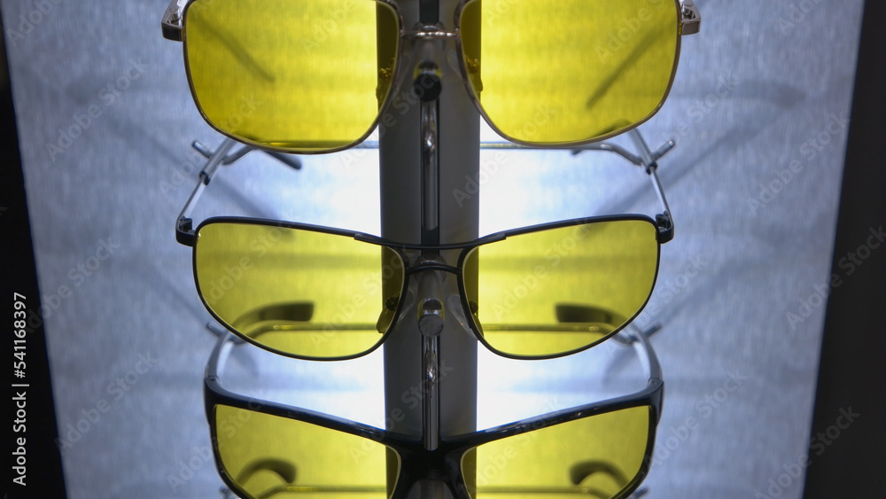 Set of stylish yellow and black sunglasses. Spectacles accessories close-up.