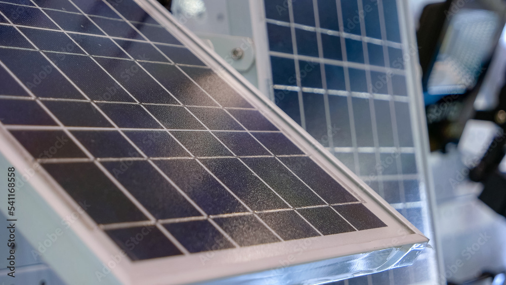 Large LED lights and solar panel indoors in the studio. Solar energy generation panel.