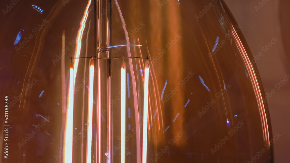 Close-up of glowing incandescent light lamp in the glass shell. Hanging bulb in the red room.