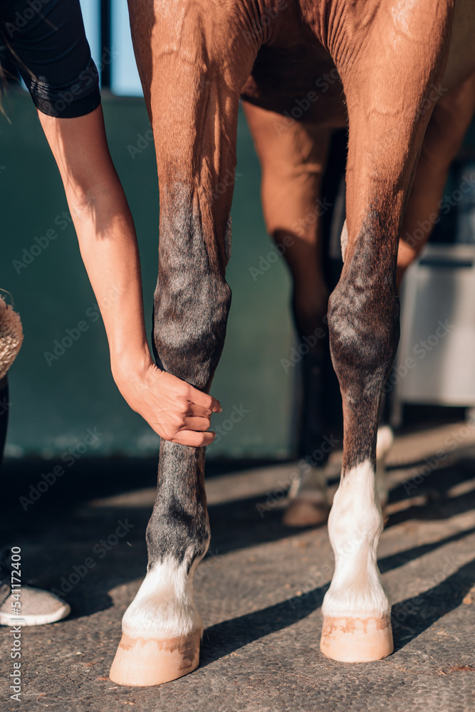 horse care stables - jockey's hand preparing the horse paws - vertical photo