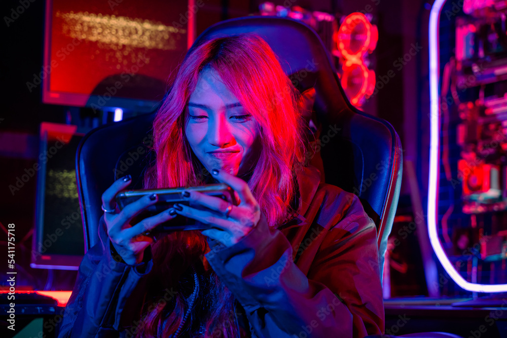 Asian woman live stream she play video game via smartphone at home neon lights living room, Gamer playing online game application on mobile phone wear gaming headphones, E-Sport concept