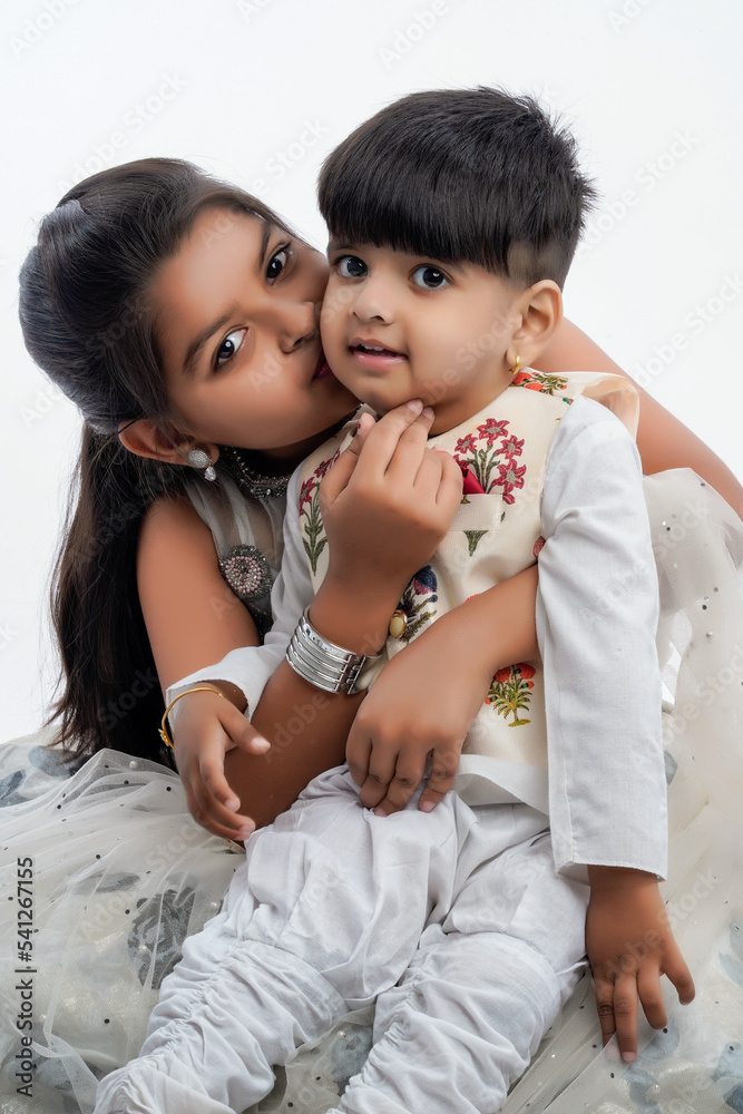 Cute little Indian asian siblings standing and embracing each other in white clothes ethnic standing against white background.