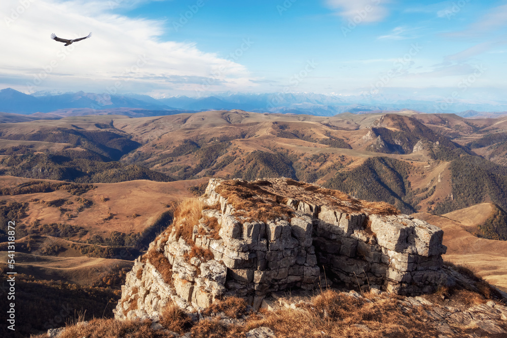 View of Bermamyt plateau rocks on sunny day. Mountains on the edge of a cliff in the distance on sunny day. Atmospheric landscape with silhouettes of mountains. Karachay-Cherkessia, Caucasus, Russia.