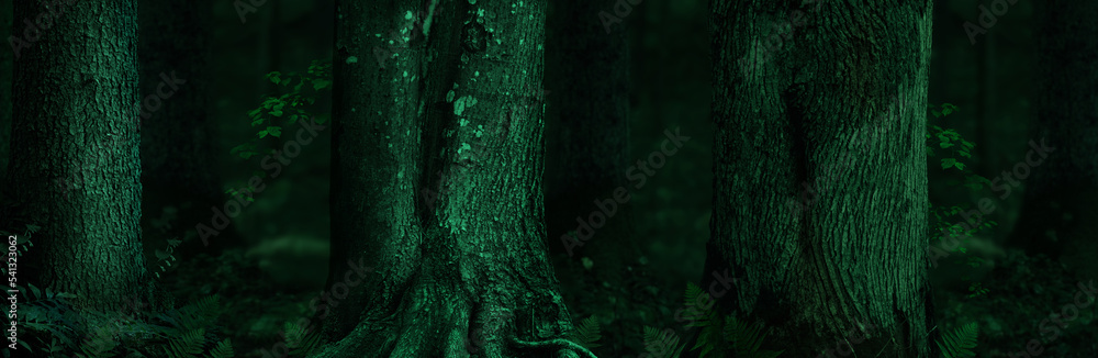 Forest panorama. Landscape with old thick trees trunks in deep shady woods
