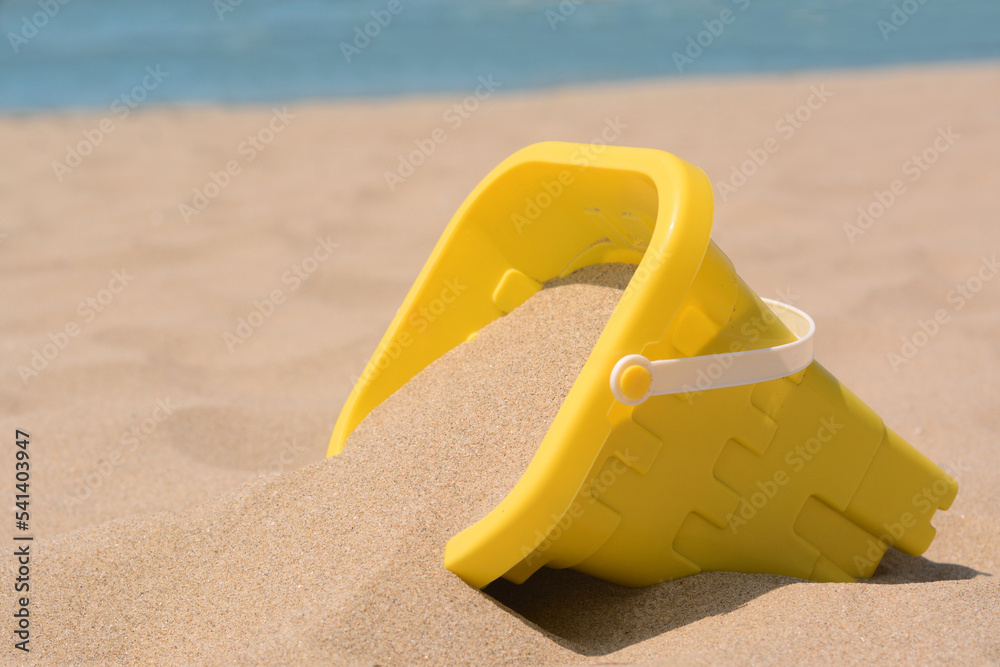 Yellow plastic bucket on sand near sea, closeup. Beach toy