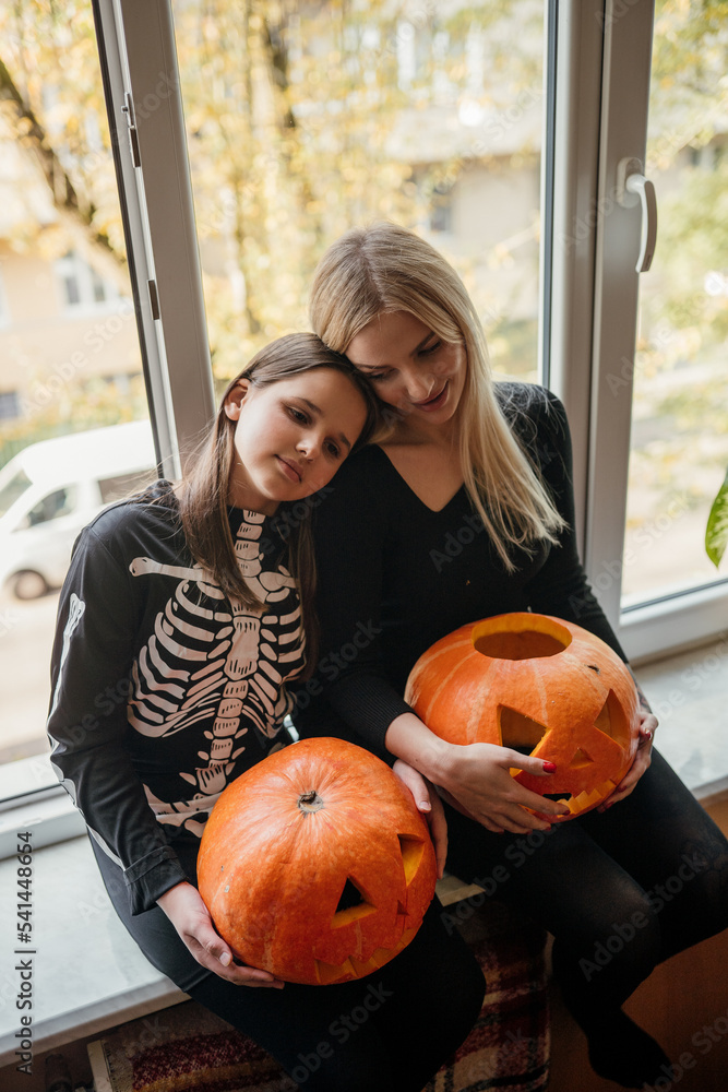 mother and daughter are happy in the kitchen with pumpkins near the windows