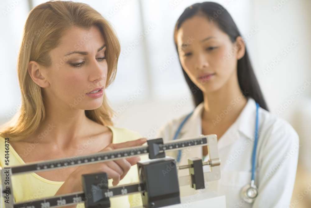 Woman Adjusting Weight Scale While Standing By Female Doctor