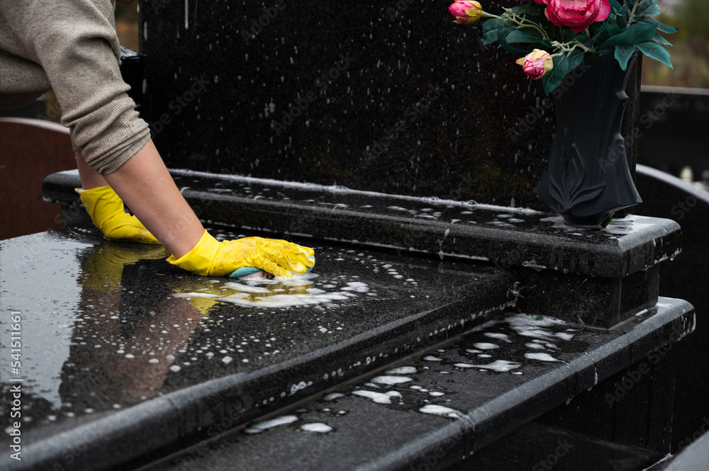 Headstone cleaning on cemetery. Professional in yellow gloves cleans the granite grave, scrubbing with sponge and water. Tombstone preparation for All Saints Day on November 1st