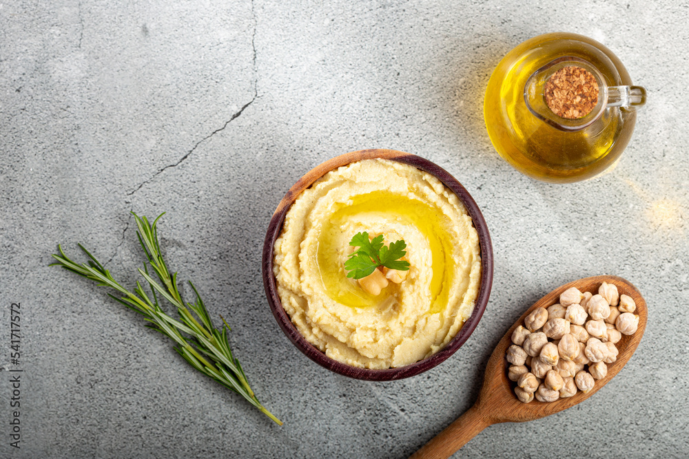 Chickpeas hummus with olive oil in the bowl.