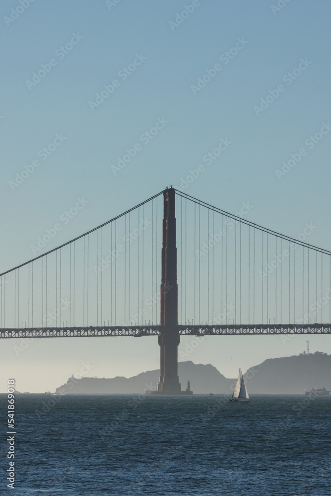 Panoramic scenic aerial view over San Francisco Bay Area with Golden Gate Bridge, downtown skyline cityscape and Alcatraz island sailing boats yachts harbor landmark sights Tower scenery