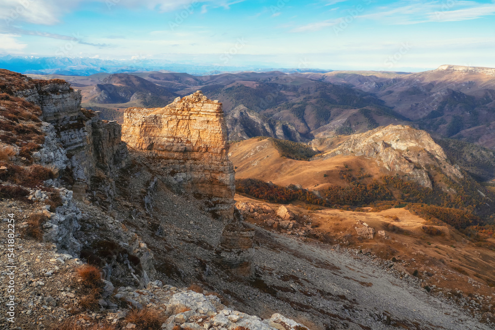 Amazing view of Bermamyt plateau rocks on sunny day. Caucasus Mountains on the edge of a cliff in the distance. Atmospheric landscape with silhouettes of mountains. Karachay-Cherkessia, Russia.