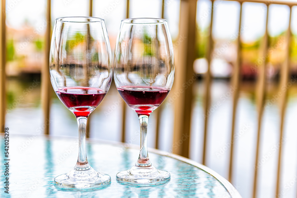 Two wineglass glasses of poured French red wine Cotes Du Rhone on glass balcony in Miami, Florida with view