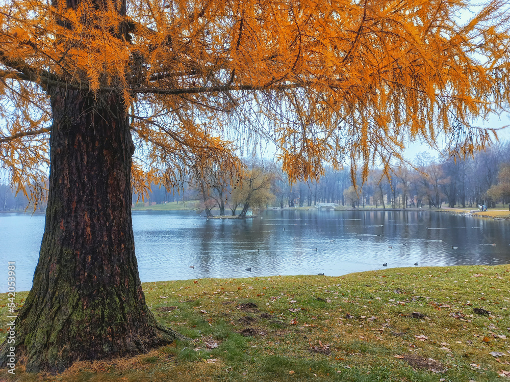 Soft focus. Mystical morning autumn landscape with fog over the lake. Foggy autumn landscape with State Museum Reserve Gatchina.