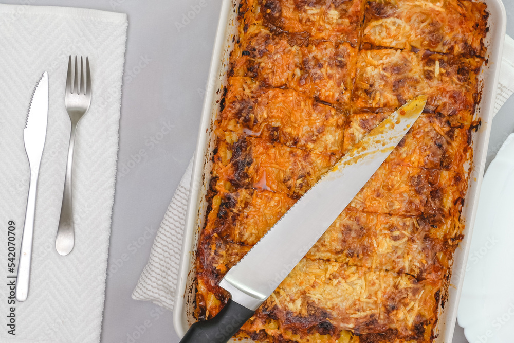 Fresh baked beef lasagna in baking dish close up on kitchen table, flat lay