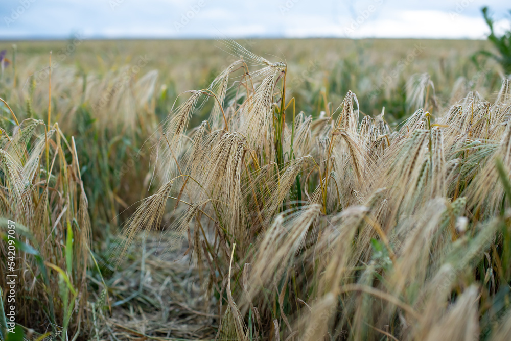 A field of ripening wheat at sunset in rainy weather in summer, close up