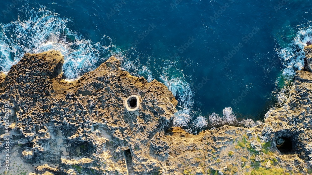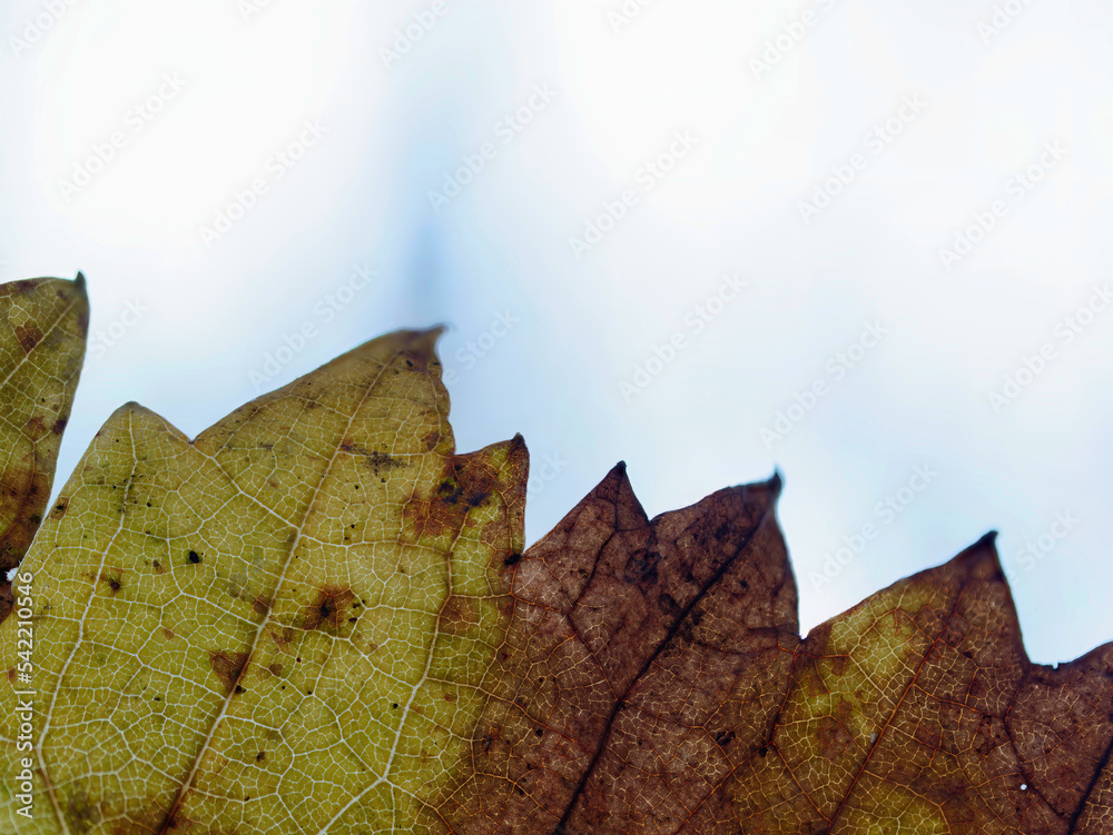Macro photo of the top of a yellow autumn leaf with a white blurry background