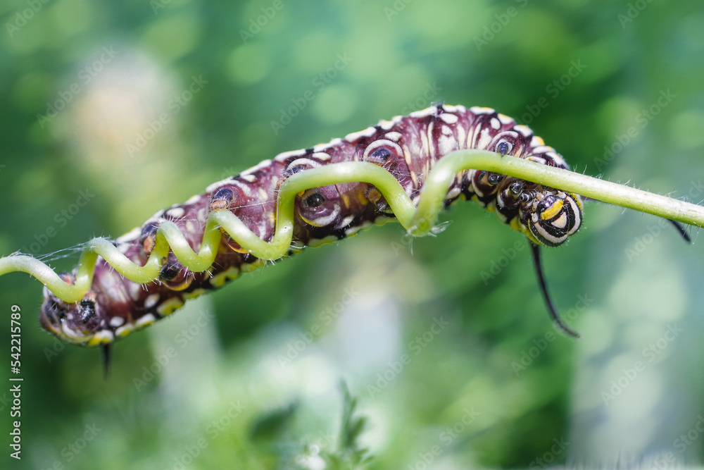 Monarch butterfly caterpillar Papilio on a forest plant on a summer day. Yellow caterpillar on a fennel. with beautifull bokeh background