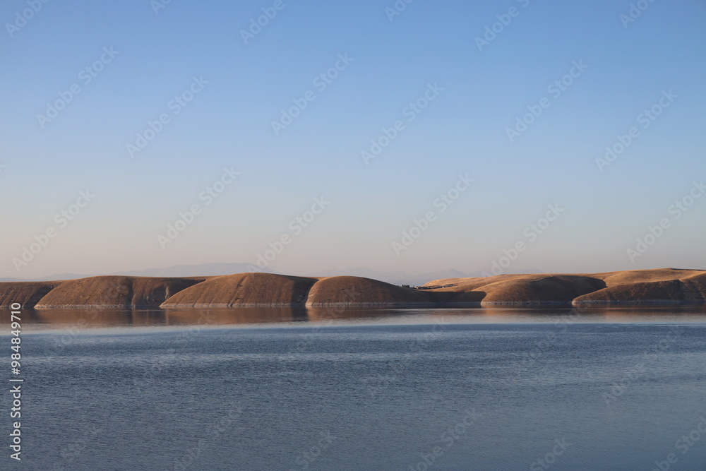 Cup of coffee on warm gray plaid background. Hot drink cappuccino in mug on blue notebook. Cozy winter still life. Top view, flat lay