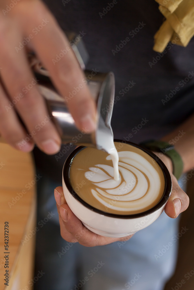 Detail shot of coffee latte being poured to form shapes by a barista out of focus hand. Training barista drawing concept.