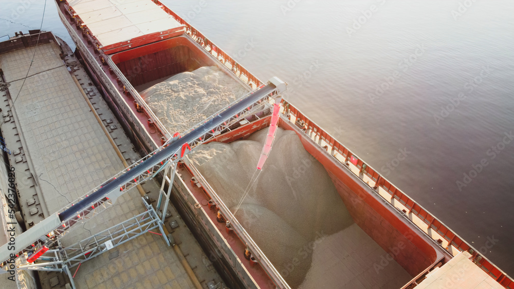 Grain loading in hold of bulk carrier ship with elevator crane closeup. Port grain elevator.