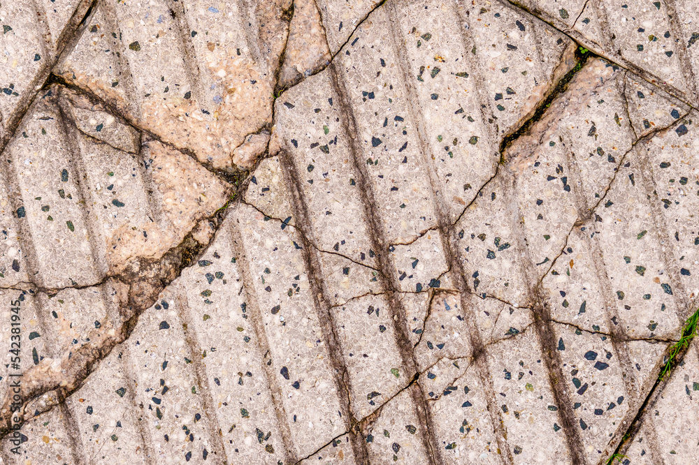 Broken damaged pavement with cracks. Deformed street tiles