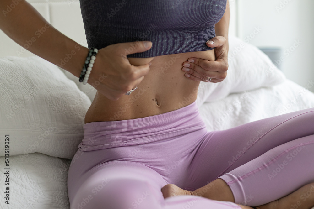 young woman with beautiful body doing uddiyana bandha asana yoga in bed at home practicing vacuum