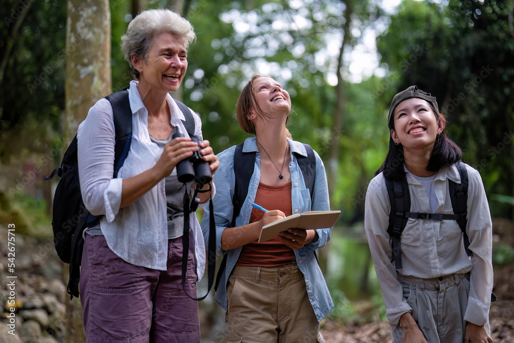 Backpack tourist travel outdoor adventure bird study using binoculars looking and record to book