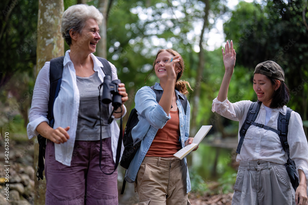 Backpack tourist travel outdoor adventure bird study using binoculars looking and record to book