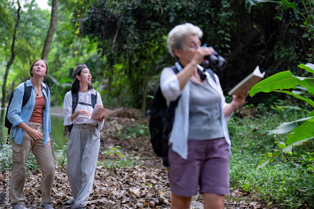Backpack tourist travel outdoor adventure bird study using binoculars looking and record to book