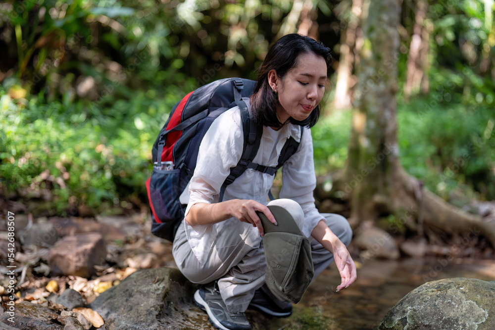 Backpack tourist travel hiking outdoor adventure use water stream from mountain washing hand
