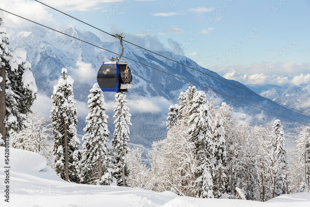 New modern spacious big cabin ski lift gondola against snowcapped forest tree and mountain peaks covered in snow landscape in luxury winter alpine resort. Winter leisure sports, recreation and travel