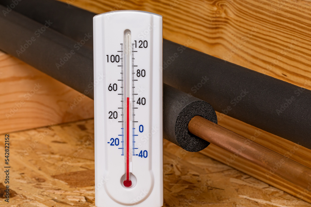 Water pipe with insulation and thermometer in house. Plumbing freezing protection, energy savings and home repair concept