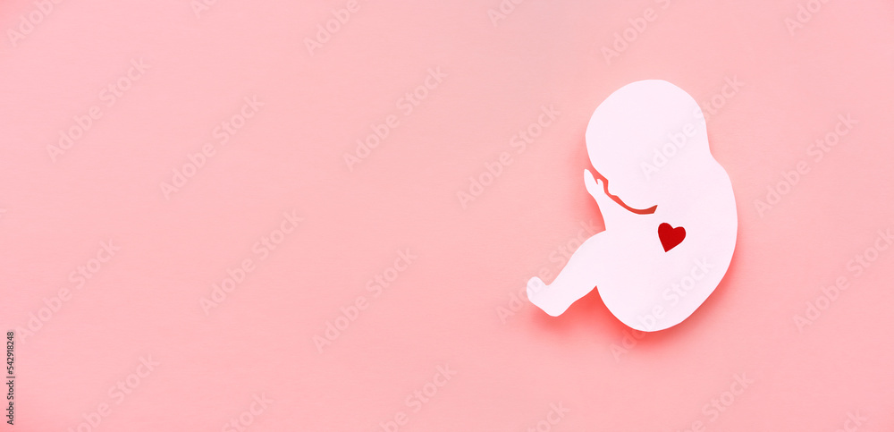 Paper silhouette of a human embryo with on a pink background. The concept of reproduction. Banner, flat lay, place for text.