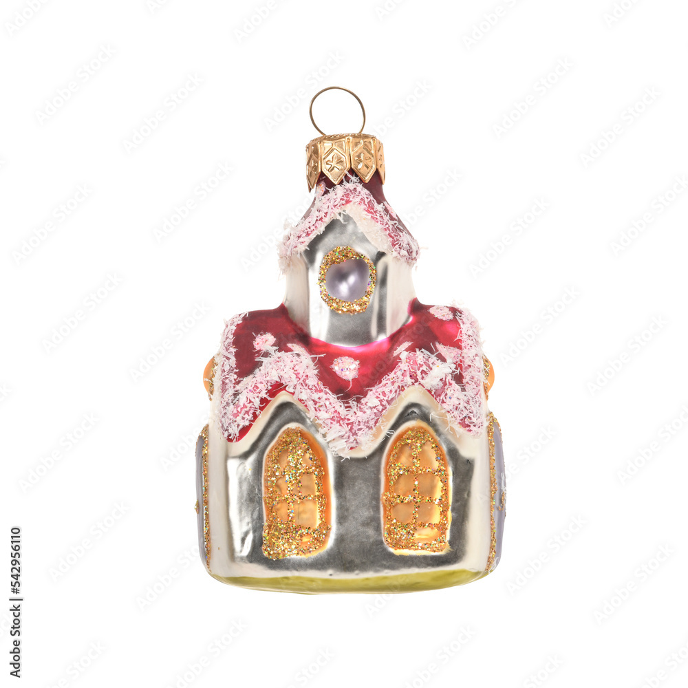 Vintage glass toy for decoration of Christmas tree. Fairy house with red roof in snow. Close up, isolated on white background for your design.