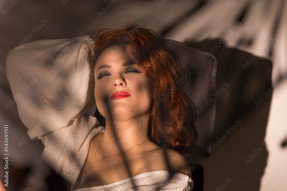 a red-haired girl lies languidly relaxed on the bed, a sexy woman is a large portrait view from above, a beautiful attractive lady put her hand behind her head