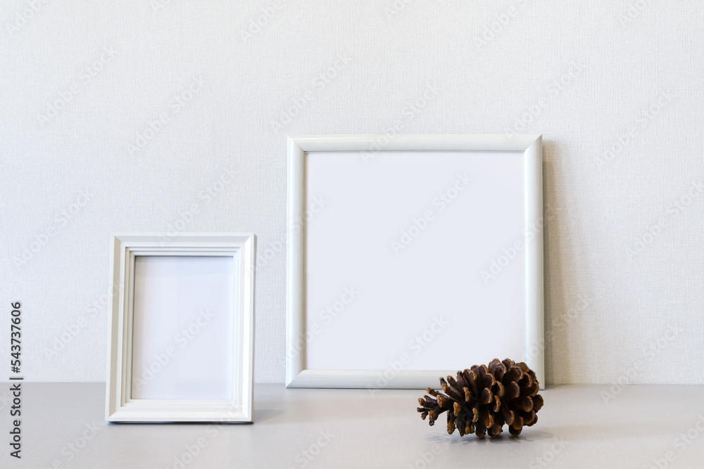 Mock up minimalist home interior with rectangular and square white wooden photo frames and big pine cone