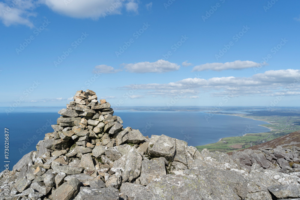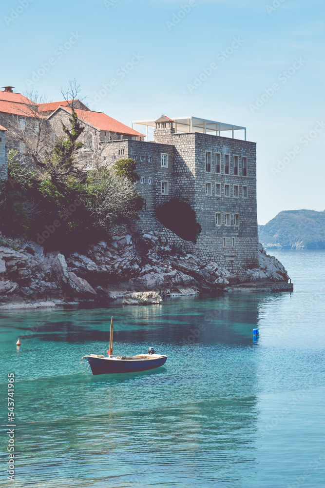 Small fishing boat on the Adriatic sea near Sveti Stefan Island, Montenegro. Turquiose water, islet with historical buildings. Mountains in the background. Fishing concept. Vertical photo