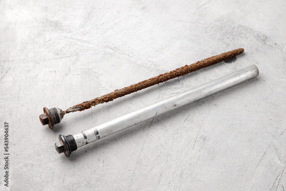 New and old magnesium anode to protect an electric water heater from rust on a gray concrete background, close-up.