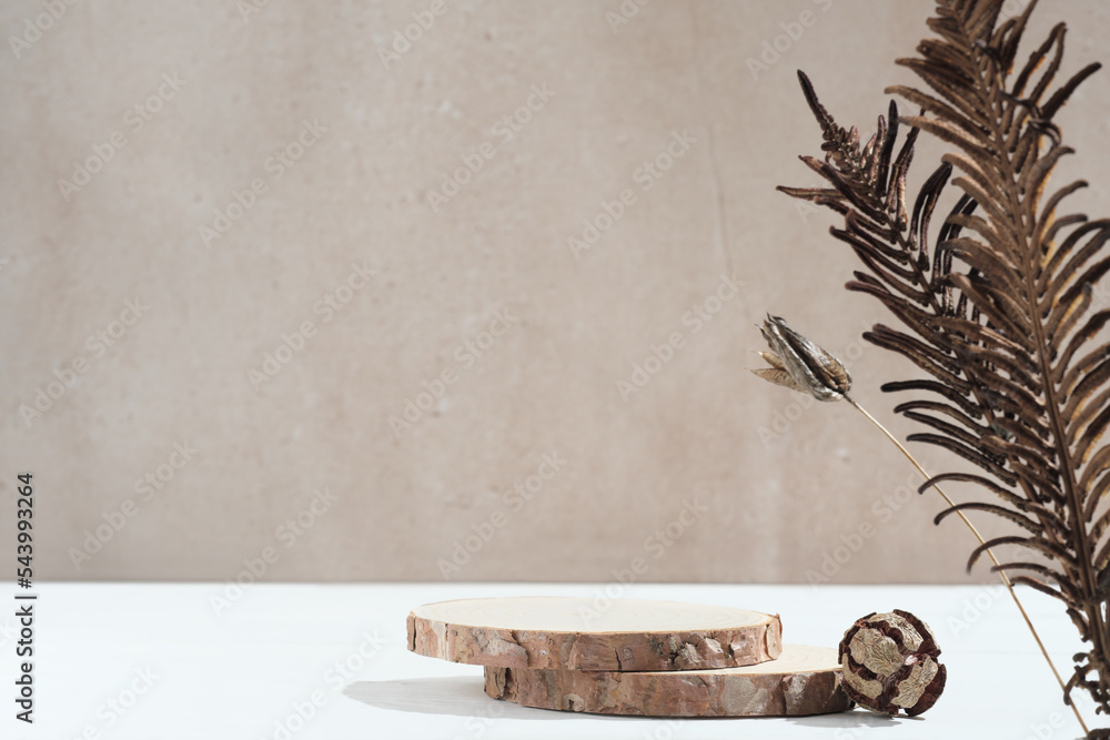 natural round wooden podium for product placement, cinnamon sticks and anise stars on tree saw cut piece. mockup for spicy product presentation. copy space
