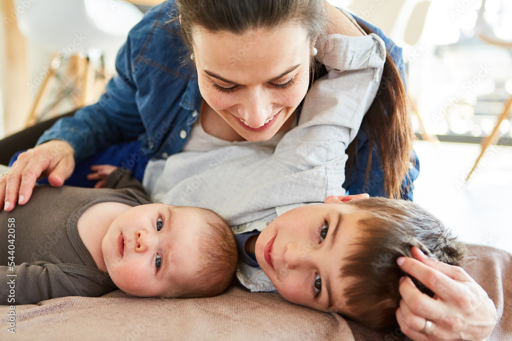 Glückliche Mutter kuschelt mit Baby und großem Bruder