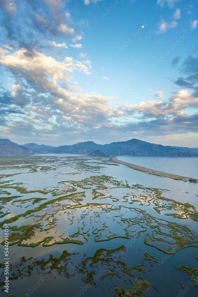 Aerial view of Dalyan river, Iztuzu beach, sea, mountains and lakes. Untouched wild nature landscape of the valley