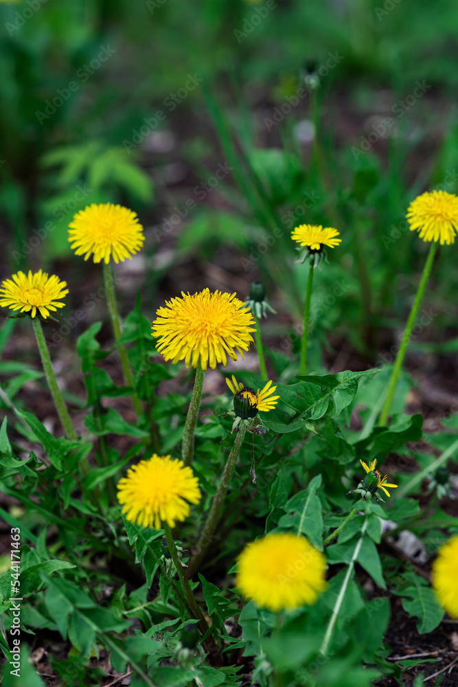 Flowering yellow Dandelion flowers in green grass. Natural background. Spring, summer concept