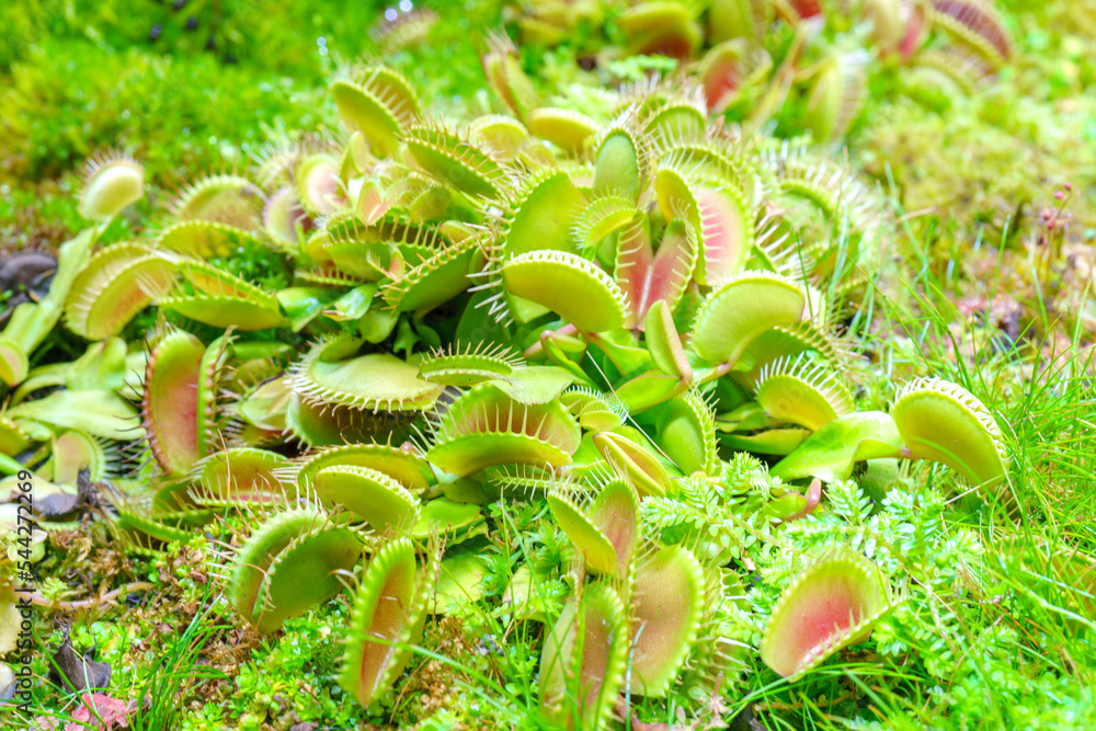 Venus flycatcher is a carnivorous plant. Terrarium with green plants. Natural background of plants.