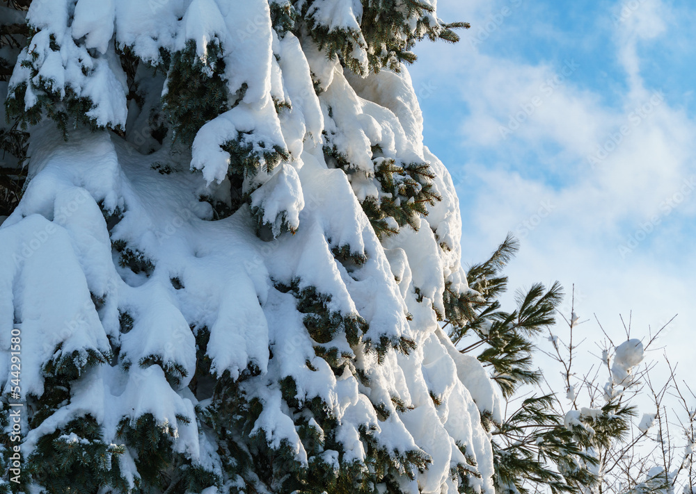 Blue spruce Picea pungens branches covered with white fluffy snow. Real winter in the garden. Sunny winter day. Christmas concept.