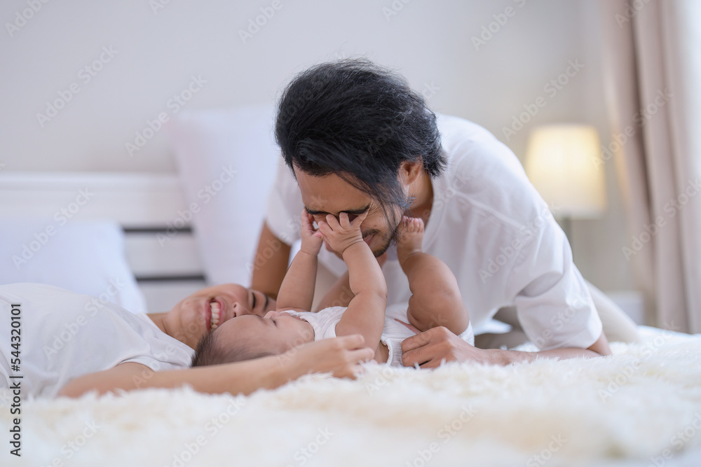 Mom and father happy joyful teasing asian infant baby new born have fun looking to parent face