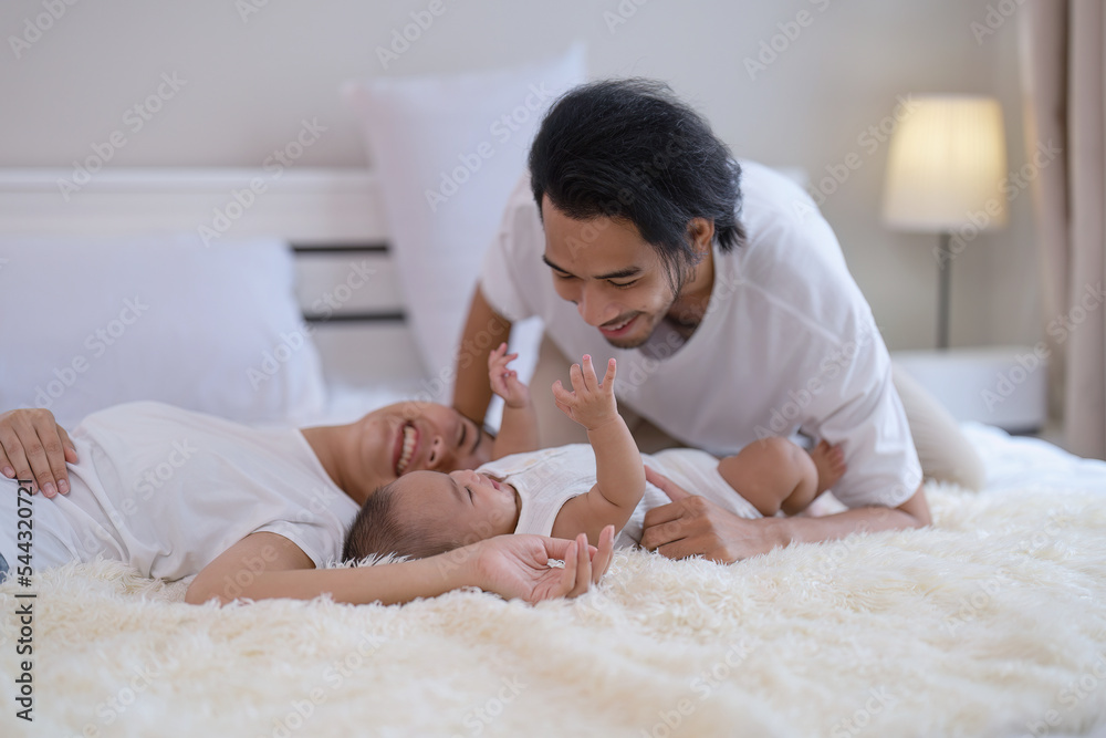 Mom and father happy joyful teasing asian infant baby new born have fun looking to parent face