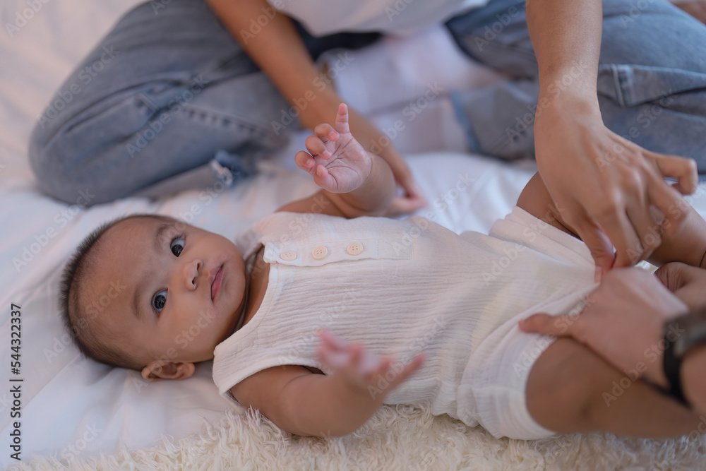 Asian infant baby new born laying on bed while mother has changed shirt