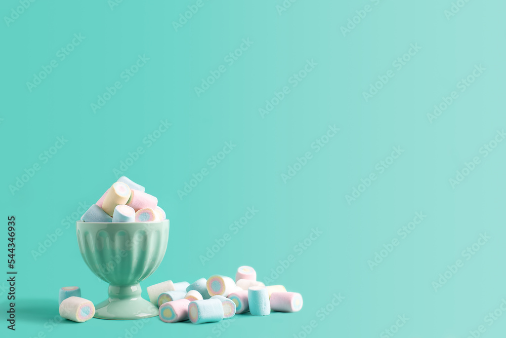 Sweet yummy marshmallows on turquoise pastel background. Place for text. Postcard for birthday, Valentine day.